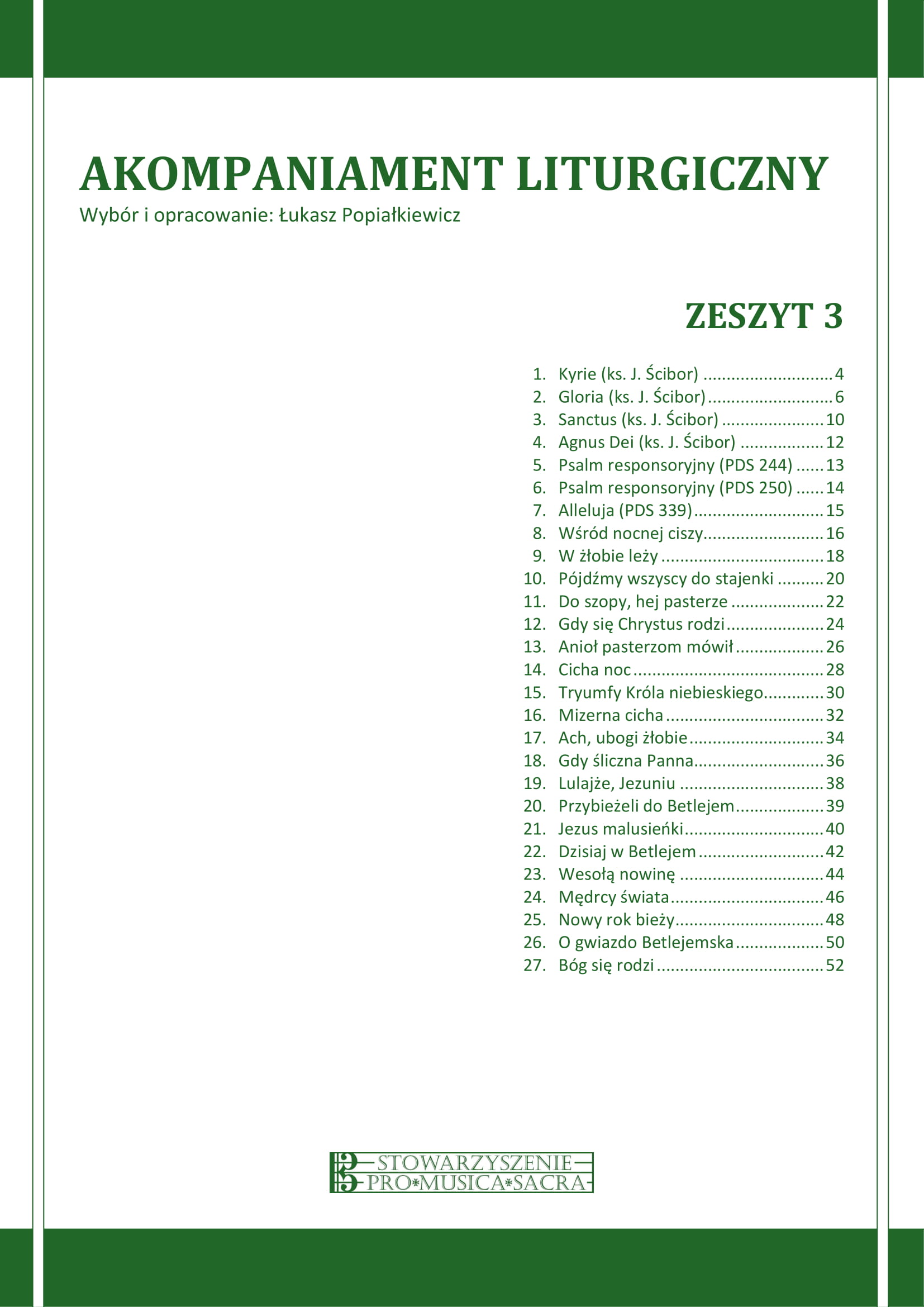 Zawiera: Kyrie ; Gloria ; Sanctus ; Agnus Dei ; Psalm responsoryjny ; Psalm responsoryjny ; Alleluja ; Wśród nocnej ciszy ; W żłobie leży ; Pójdźmy wszyscy do stajenki ; Do szopy, hej pasterze ; Gdy się Chrystus rodzi ; Anioł pasterzom mówił ; Cicha noc ; Tryumfy Króla niebieskiego ; Mizerna cicha ; Ach, ubogi żłobie ; Gdy śliczna Panna ; Lulajże, Jezuniu ; Przybieżeli do Betlejem ; Jezus malusieńki ; Dzisiaj w Betlejem ; Wesoła nowine ; Mędrcy świata ; Nowy rok bieży ; O gwiazdo Betlejemska ; Bóg się rodzi, moc truchleje.