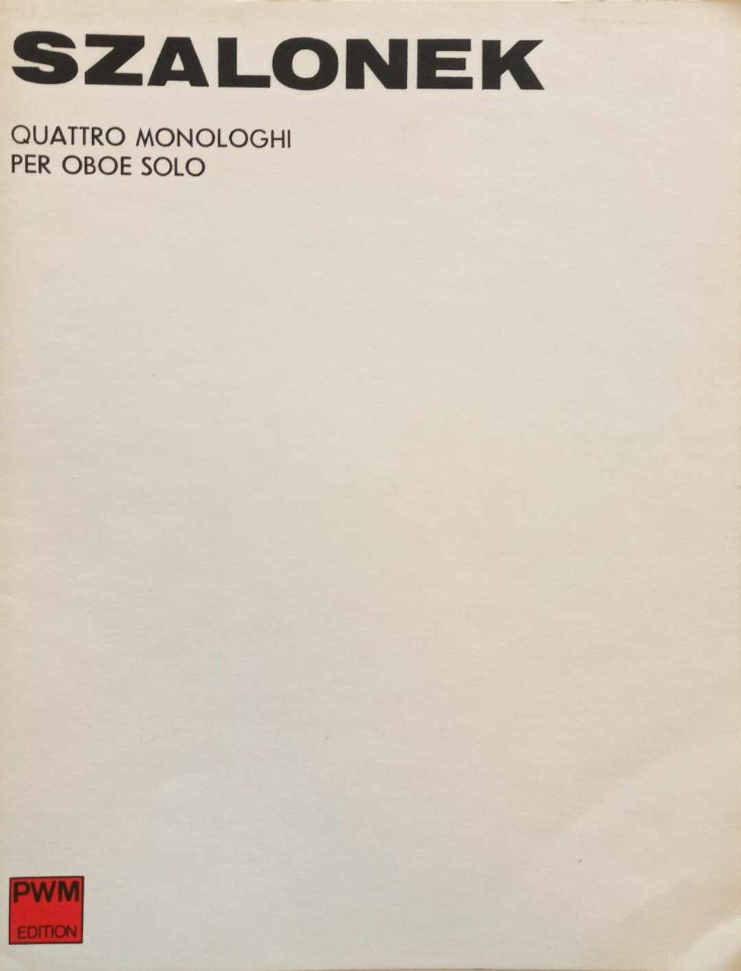 Quattro monologhi per oboe solo / Witold Szalonek. - Wydanie 3. - Kraków : Polskie Wydawnictwo Muzyczne, druk 1978. - Teka (5 kart złożonych) ; 31 cm.
